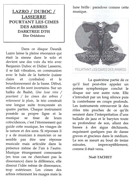 Dans ce disque Daunik Lazro laisse la pleine résonance qui était la sienne dans le solo et devient une des voix du trio avec Benjamin Duboc et Didier Lasserre, il se fait vibration, en communion avec le halo de la batterie (caisse claire et cymbales) et le bourdonnement de la basse. Début, milieu et fin sont incertains. Sur un haïku de Bashô, Une lune vive / pourtant / les cimes des arbres / retiennent la pluie, le trio construit une longue suite tronçonnée en quatre parties. Chaque instrument possède sa propre ligne et la musique se tisse de leurs coïncidences, c’est l’étonnement qui guide cette musique, les visages de la nature et des sons. Si réponses il y a de musicien à musicien ce ne semble pas être une réponse musicale mais articulée dans la présence même de l’un à l’autre. Musique étrangement consonante (en tous cas ne cherchant pas la dissonance) dans la différence, elle dissout l’idée même de dissonance, trop extérieure. Les cimes des arbres retiennent les nuages mais la lune brille : paradoxe comme cette musique.