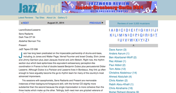 • Chronique par Ken Waxman sur JazzWord (21 août 2014)